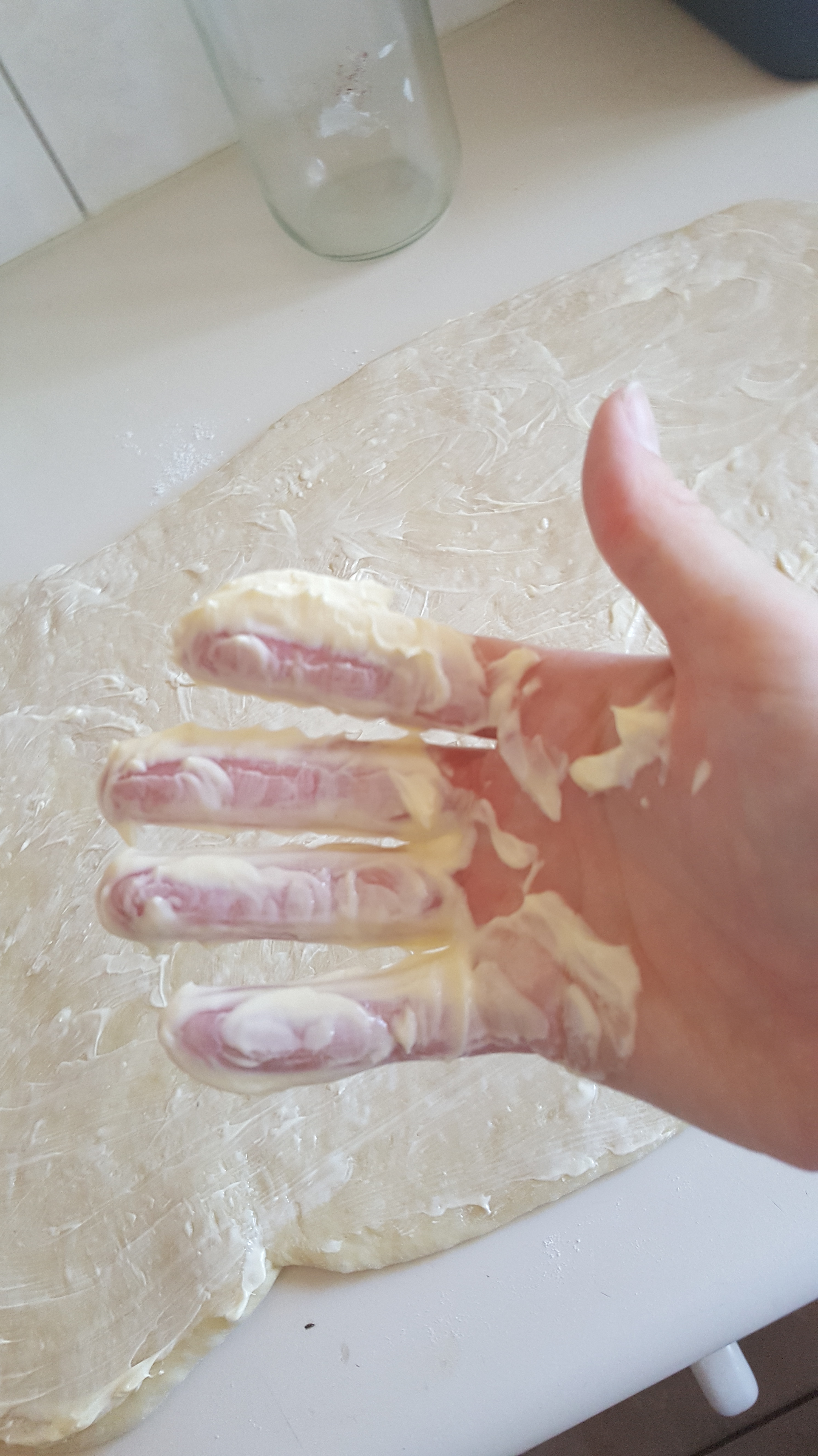 First off, I added everything to the bread machine (after a early morning walk to the ahops for some milk) and waited for 1.5 hours while it kneeded the dough and allowed it to rise. The dough then needed to be rolled out into a rectangle. I don’t have a rolling pin, so I improvised (See the jar at the top of the pic? Yeah. That.). I smooshed margerine all over it with my fingers, as Fun, Cheap or Free suggests, which was totally fun but the end result was…messy.