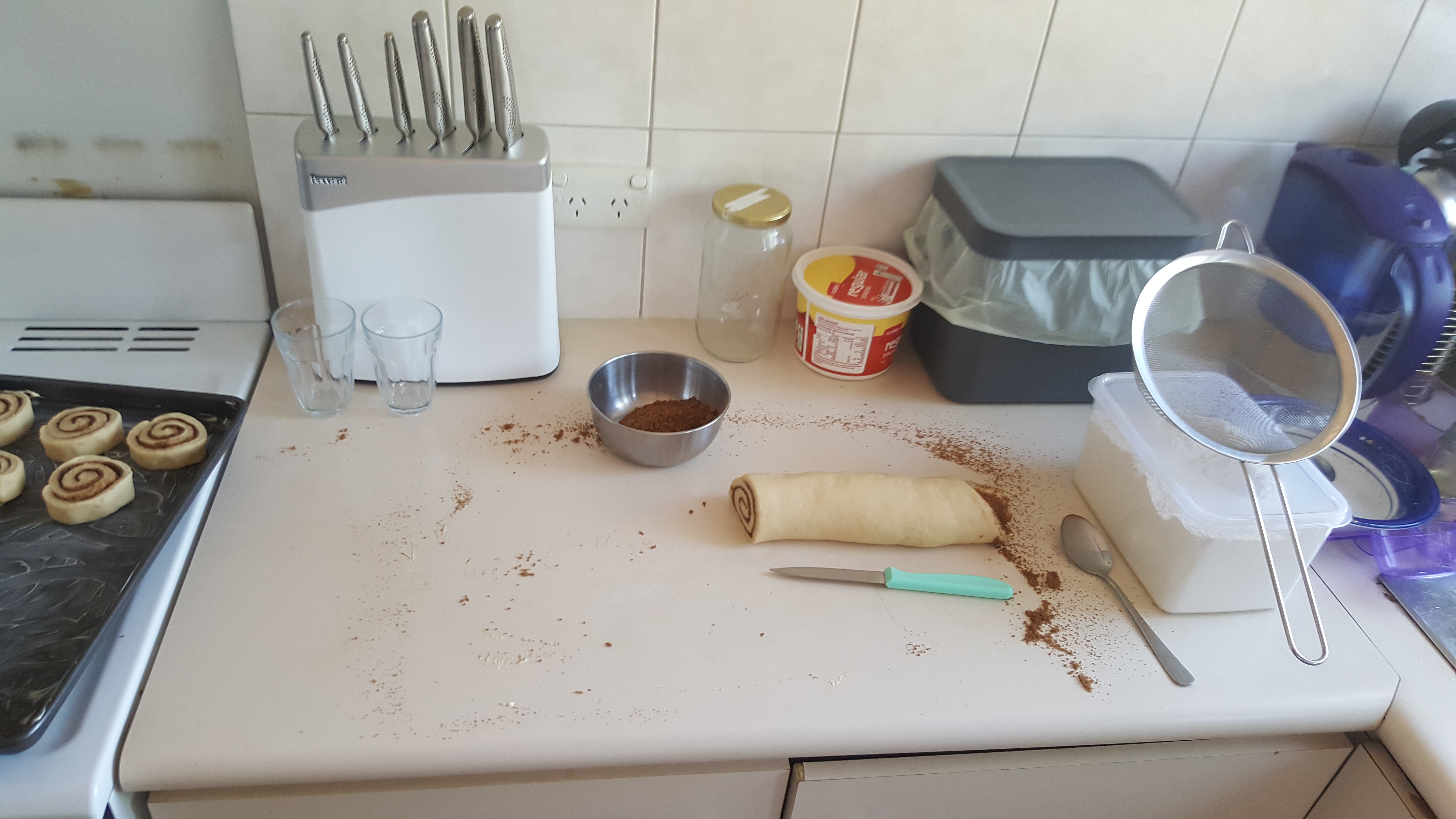 The rolls I cut are on the left and my “rolling pin” is in the middle.