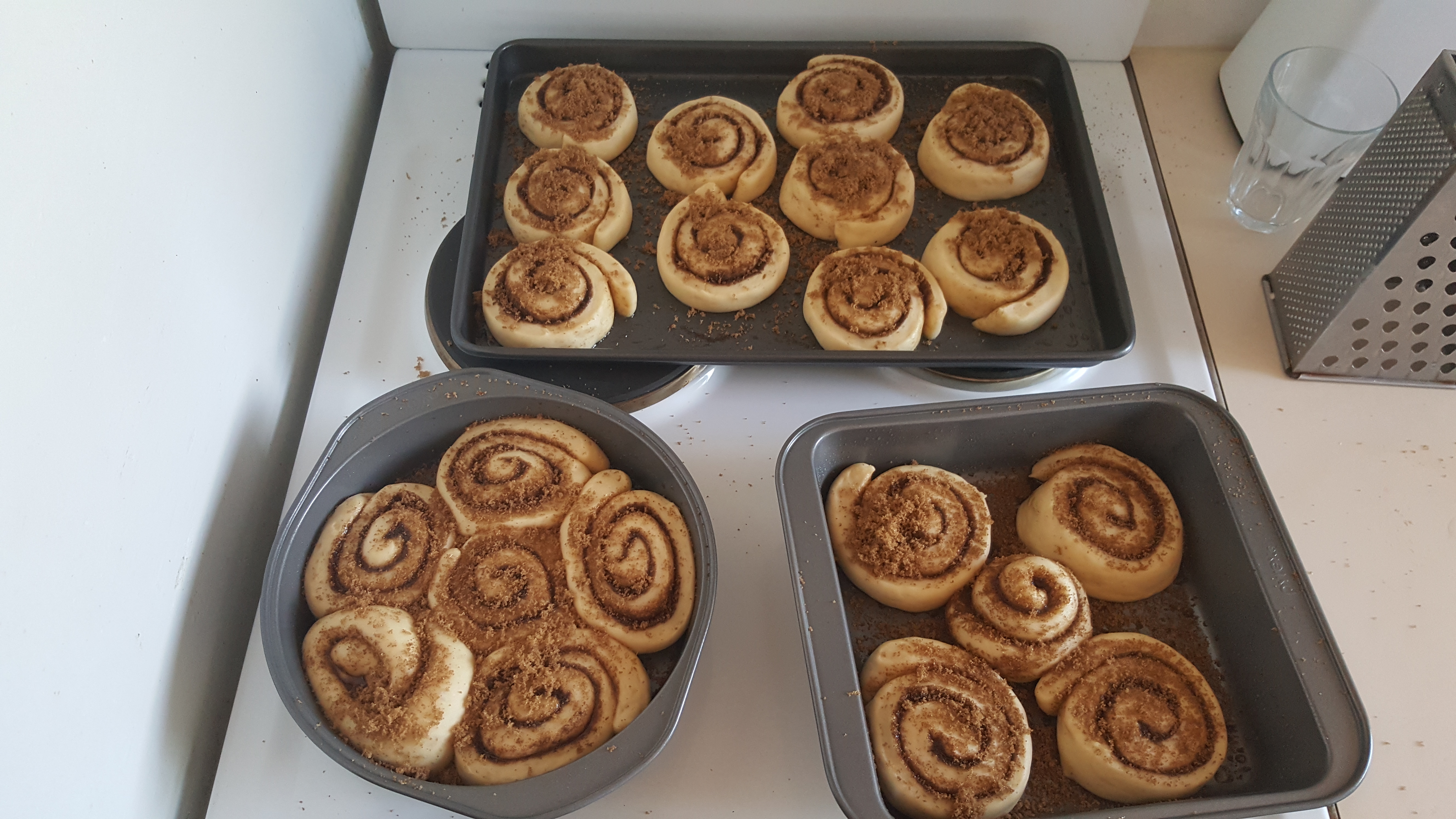 Sprinkle the cinnamon and brown sugar mix over with a sieve and roll the dough! I cut each roll to be about 2cm wide…tall?…long? Anyway I got a lovely even 21 scrolls out of this recipe! I let them sit in a warm oven for about 15 minutes (I couldn’t wait the suggested 30 minutes. I wanted my scrolls!). They cooked for about 20 minutes, but didn’t brown. To check if they were cooked, I cut into one of them. Is there a better way? I’ve never made dough things before! Besides pizza. Mmmm… pizza…